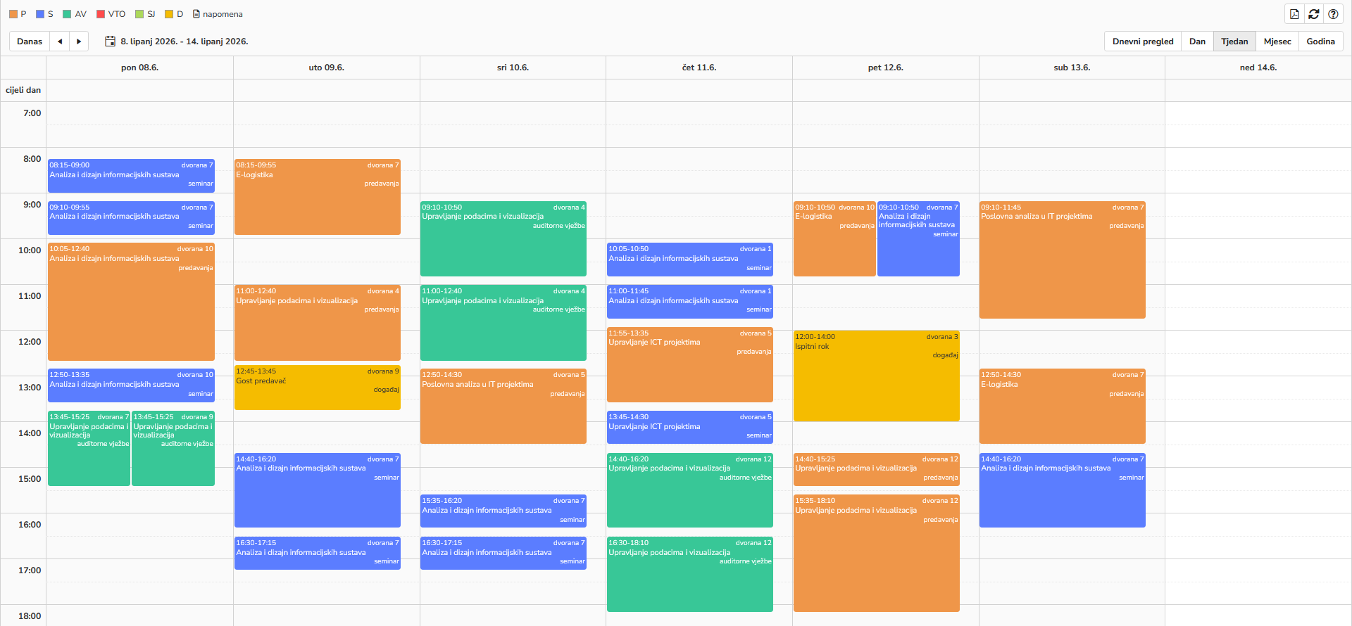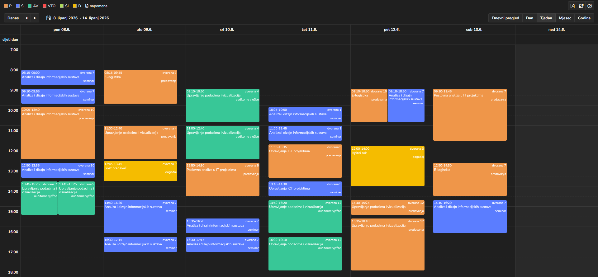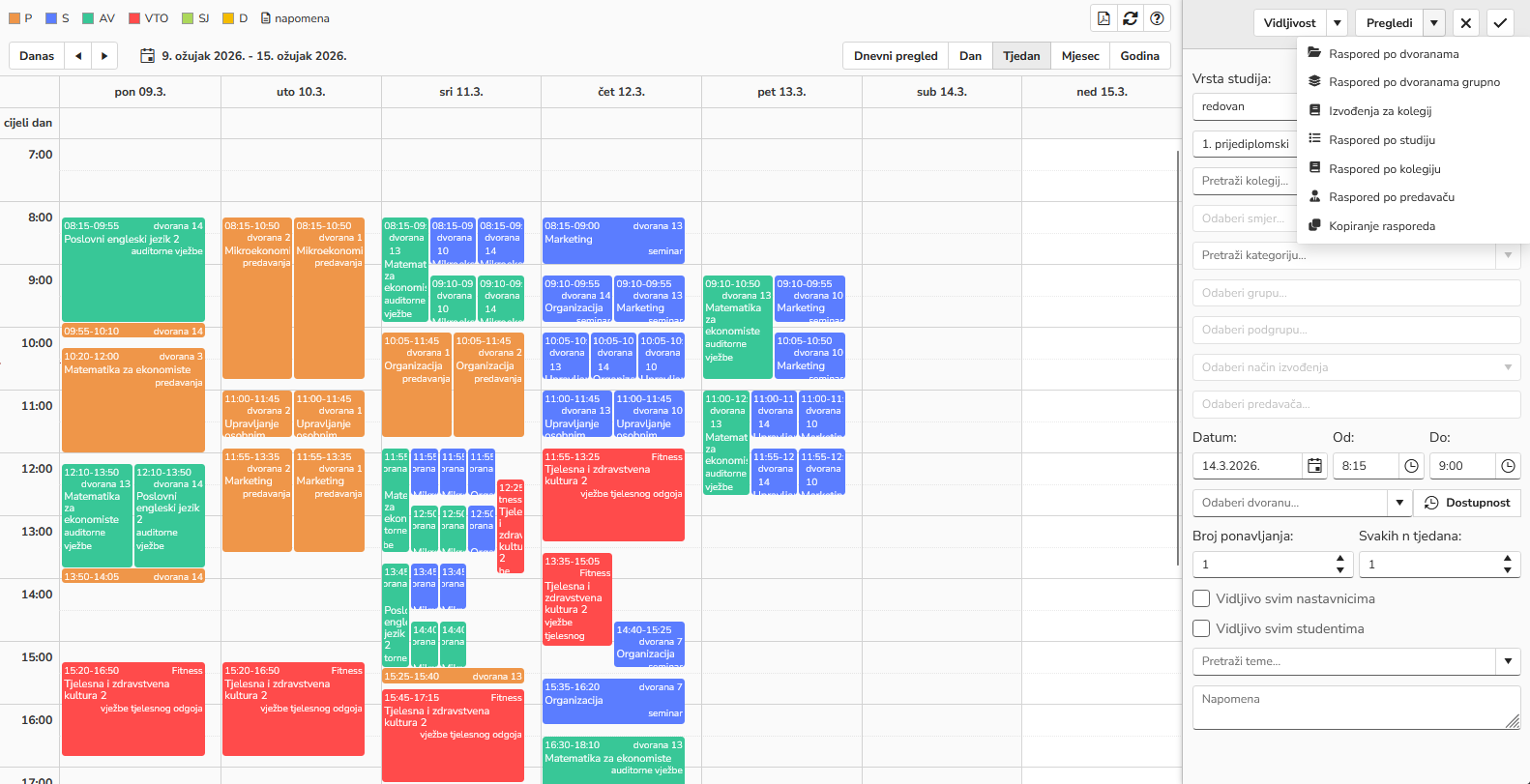 Kreiranje i pregled rasporeda sati, provjera raspoloživosti dvorana, automatsko otkrivanje preklapanja i izvoz u iCal format.