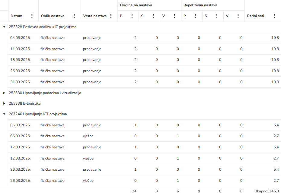 Dokumentirajte sve održane sate nastave po predavačima. Pratite kontaktne sate, radne sate i sate rada za svaki tip nastave - predavanja, seminare i vježbe.