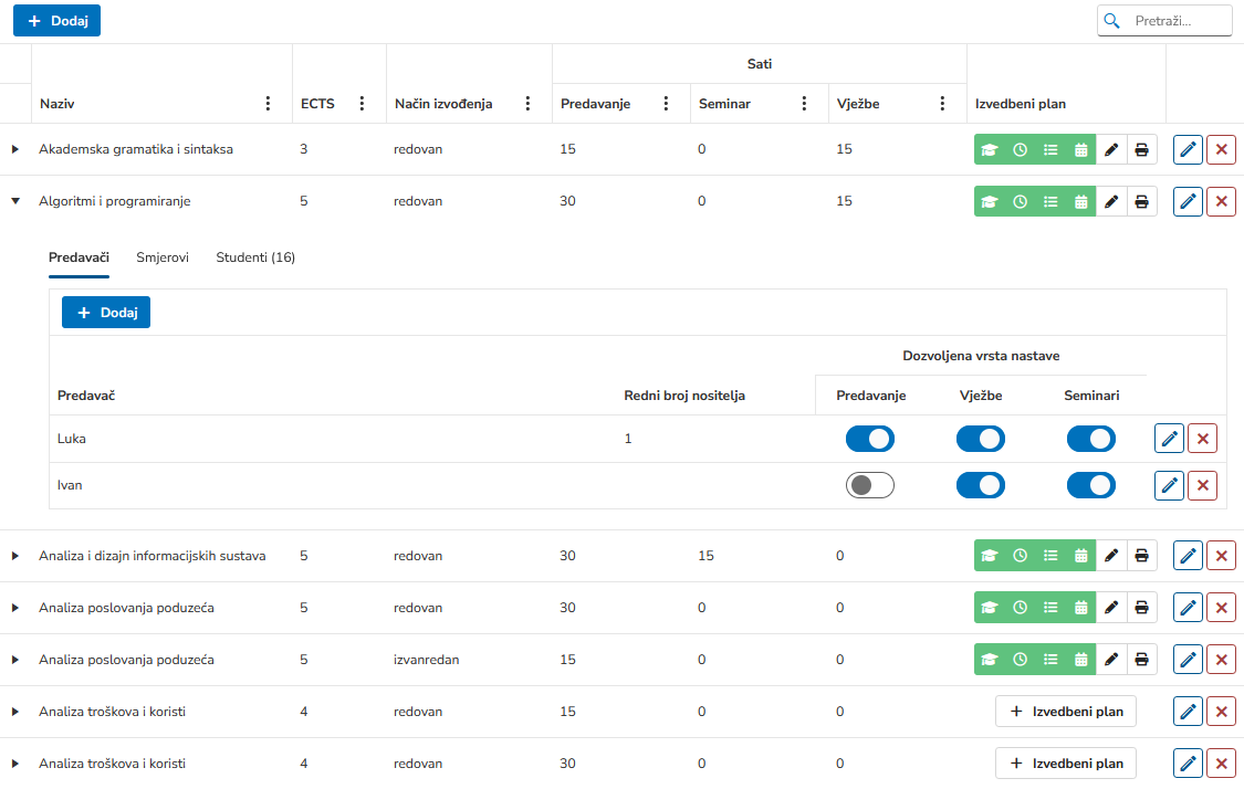 Definirajte ishode učenja, ispitne rokove, teme nastave i obveznu literaturu za svaki kolegij. Upravljajte komponentama nastave i metodama izvođenja.